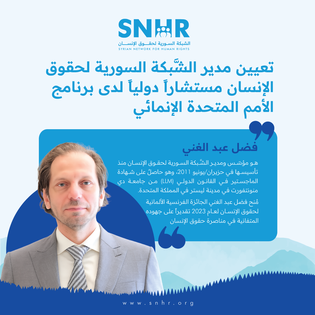 يسرّ الشَّبكة السورية لحقوق الإنسان أن تعلن عن تعيين مؤسِّسها ومديرها التنفيذي، الأستاذ فضل عبد الغني، بصفة استشاري لدى برنامج الأمم المتحدة الإنمائي (UNDP) في شمال أفريقيا. لقد عُرف فضل عبد الغني على مدى أعوام بنهجه المهني في التوثيق والمناصرة، وبمساهمته النقدية البنّاءة تجاه السياسات العامة ذات الصلة بحقوق الإنسان والعدالة في سوريا.