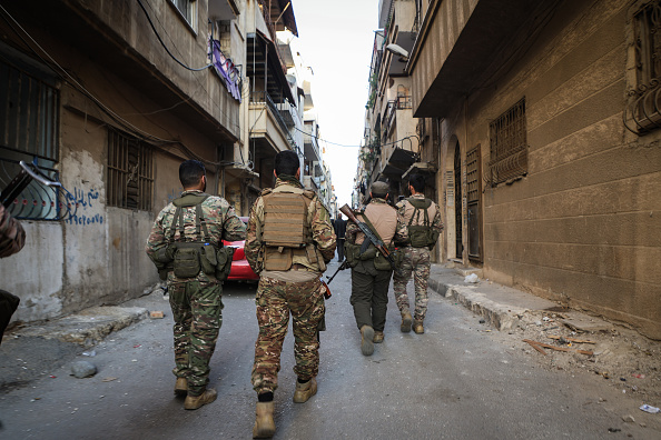 HOMS, SYRIA NOVEMBER 23: Syria's soldiers take security measures as Internal Security Command declared a temporary curfew in the city of Homs following a double homicide that resulted in the killing of one man and one woman, in Homs, Syria on November 23, 2025. Authorities stated that the curfew will remain in effect between 17:00 and 05:00 local time. (Photo by Abobaker Alsaka/Anadolu via Getty Images)