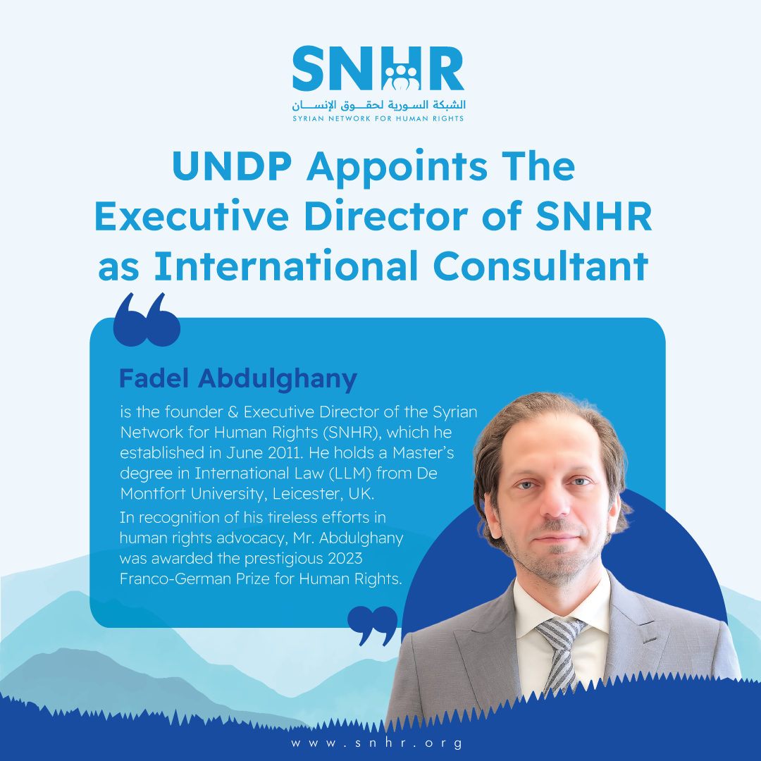 The Syrian Network for Human Rights (SNHR) is glad to announce that its executive director and founder Mr. Fadel Abdulghany, has been appointed as a consultant for the United Nations Development Program (UNDP) in North Africa. Over the years, Mr. Abdulghany has been known for his professionalism in documentation and advocacy work, and his constructive criticism for public policies, that are related to human rights and justice, in Syria.